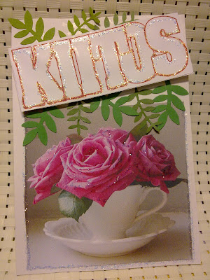 Lauran haaste oli keittiöstä korttiin. Otin hedelmäsäilyke purkista etiketin ja leikkasin siitä hedelmät. Ylä ja alareunaan laitoin stanssattua pitsiä. Lisäksi tyttö leimakuva sivuun kohotettuna 3d tarroilla.Teksti vain ja vähän kimalletta kukkiin.