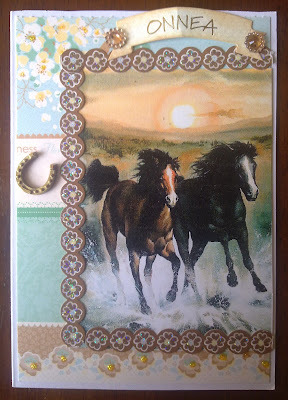 Tein sarjassa 4 heppakorttia yksinkertaisella tyylillä. Pitsiä, nauhoja, timantteja, hevosenkenkiä ja kukkasia heppakuvan koristeiksi.